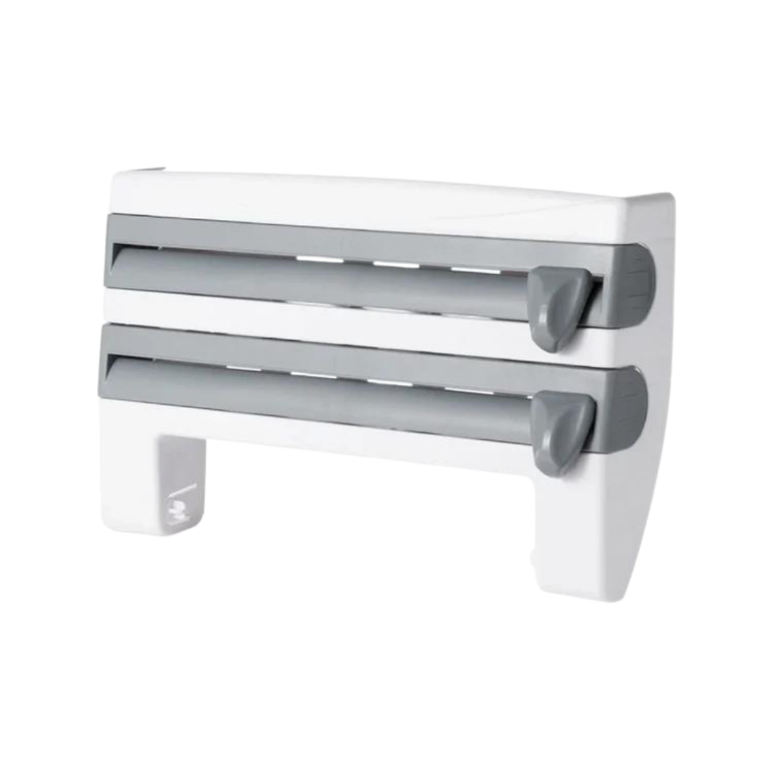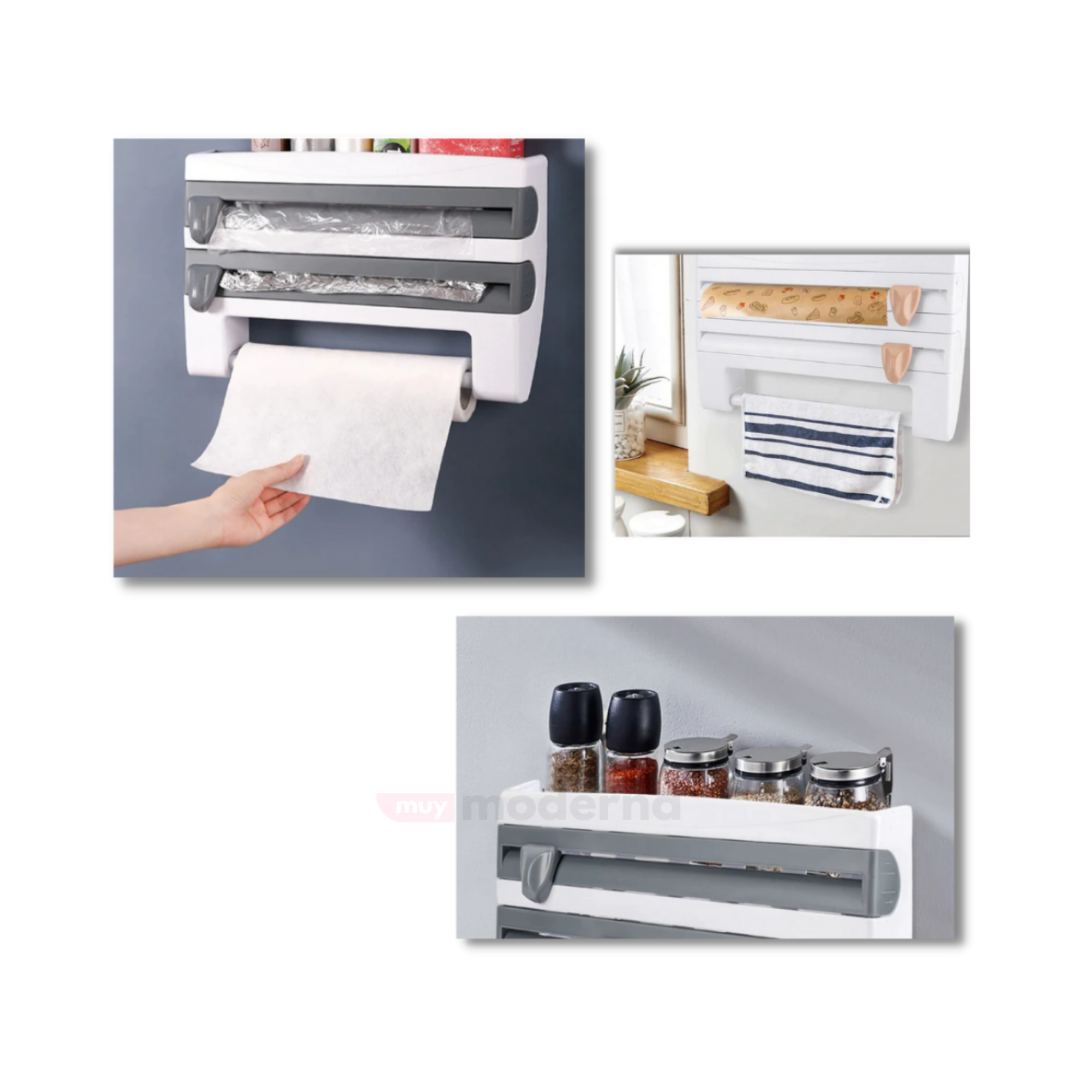 - Soporte de papel 4 en 1 para montaje en pared: coloque papel de plástico, papel de aluminio y toallas de papel de cocina perfectamente en un lugar fijo. También hay un estante superior para guardar tarros de especias.