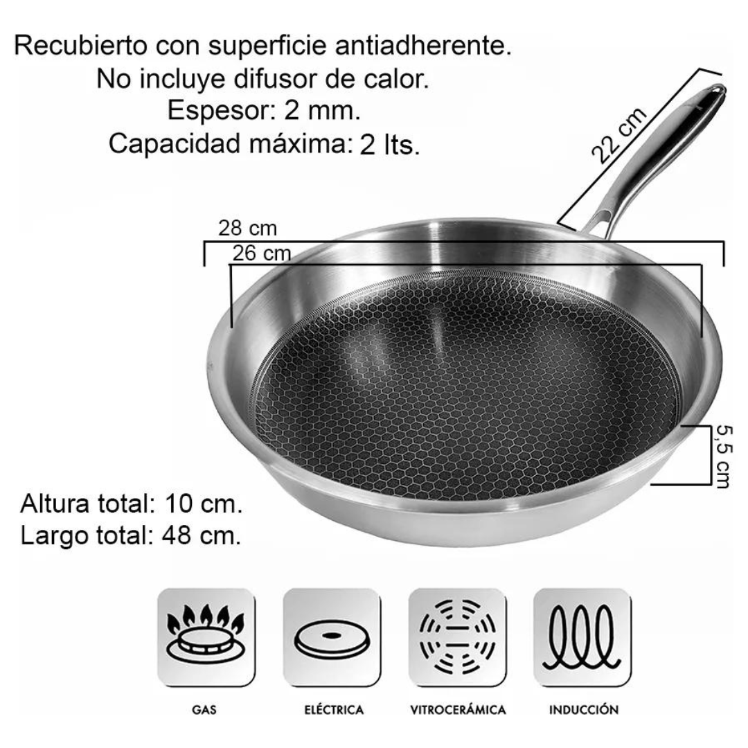 - Espesor: 2 mm, con interior antiadherente resistente al uso de utensilios metálicos.